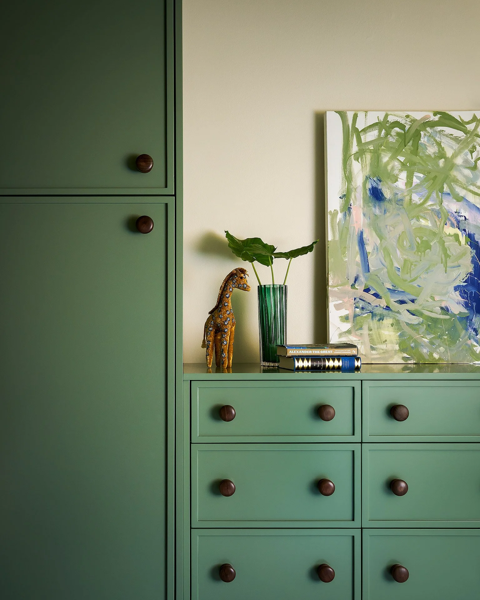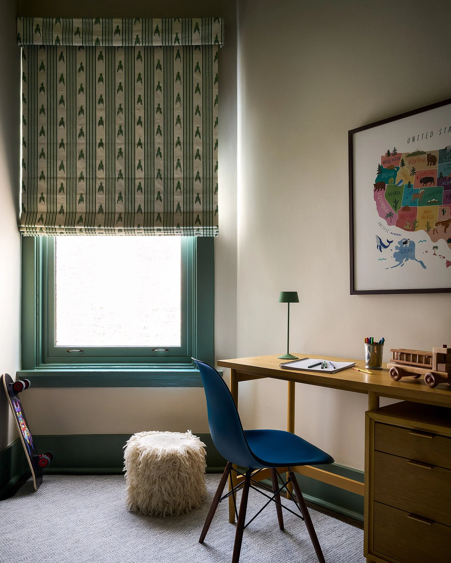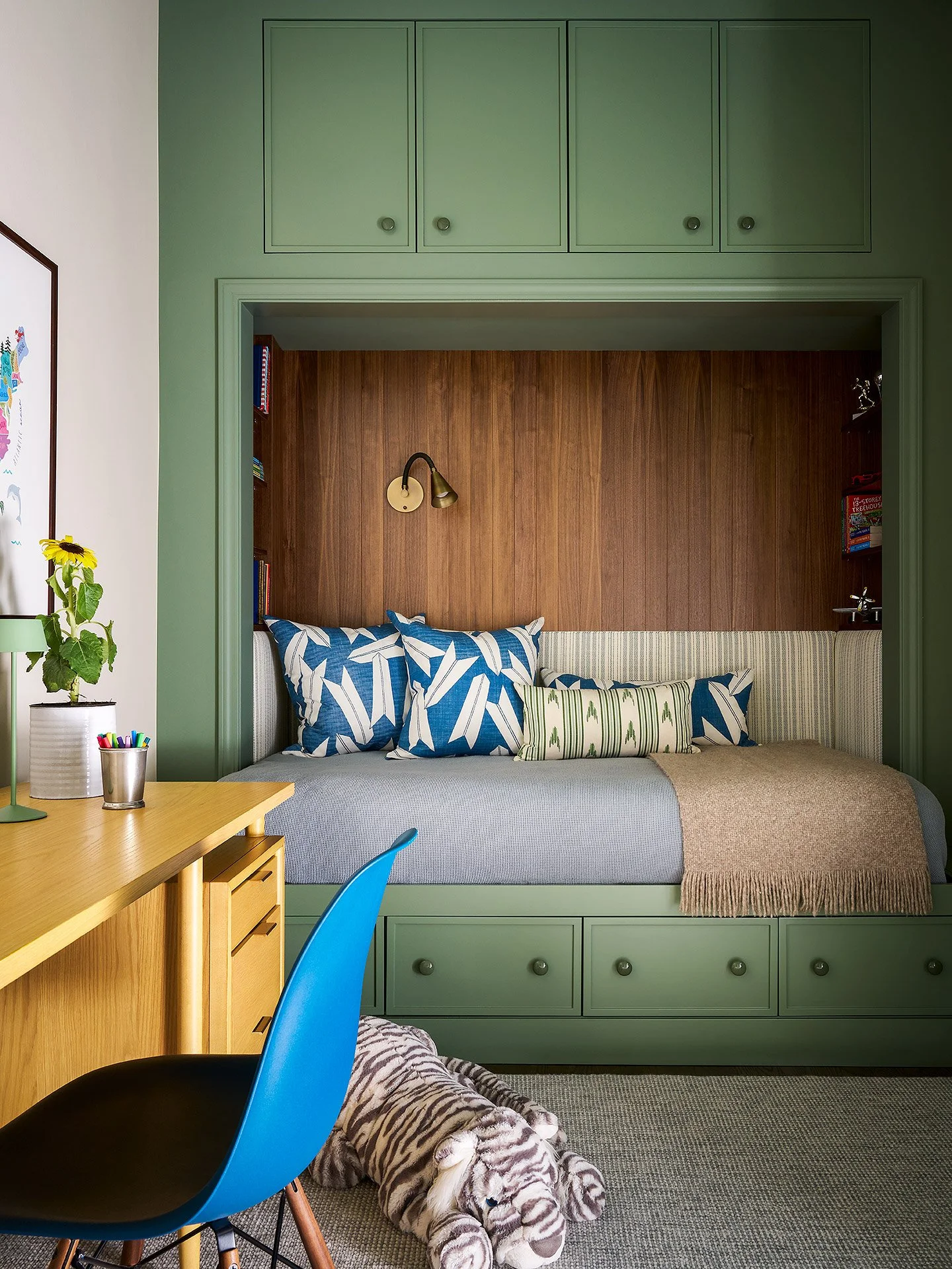 In this corner bedroom, storage solutions were the name of the game. This bed nook with built-in shelving required moving existing HVAC locations and rewiring the space for the reading light. Upholstered boards and wood paneling completed the bed area, and additional millwork through the room created even more storage. Fresh coats of paint finished off the room.