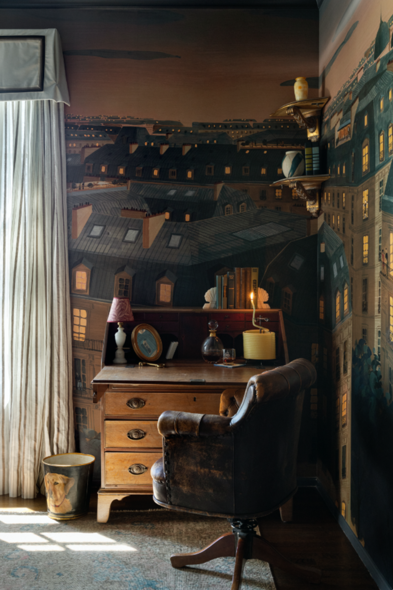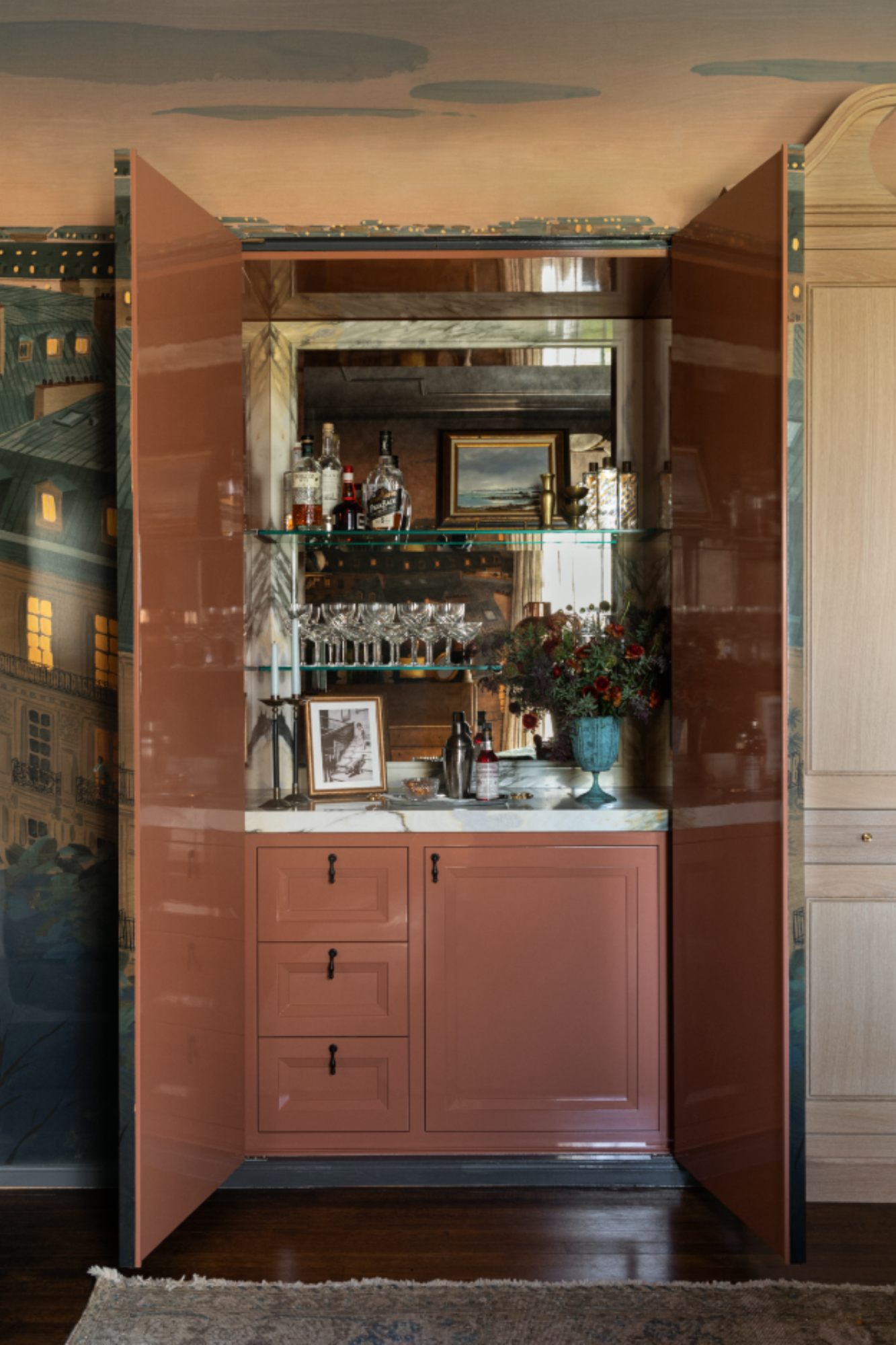 Partnering with Centered By Design's Claire Staszak, we updated a man's dressing room in the 2023 Lakeforest Showhouse. We updated the closet and created a built-in bar concealed by meticulously trimmed wallpaper.