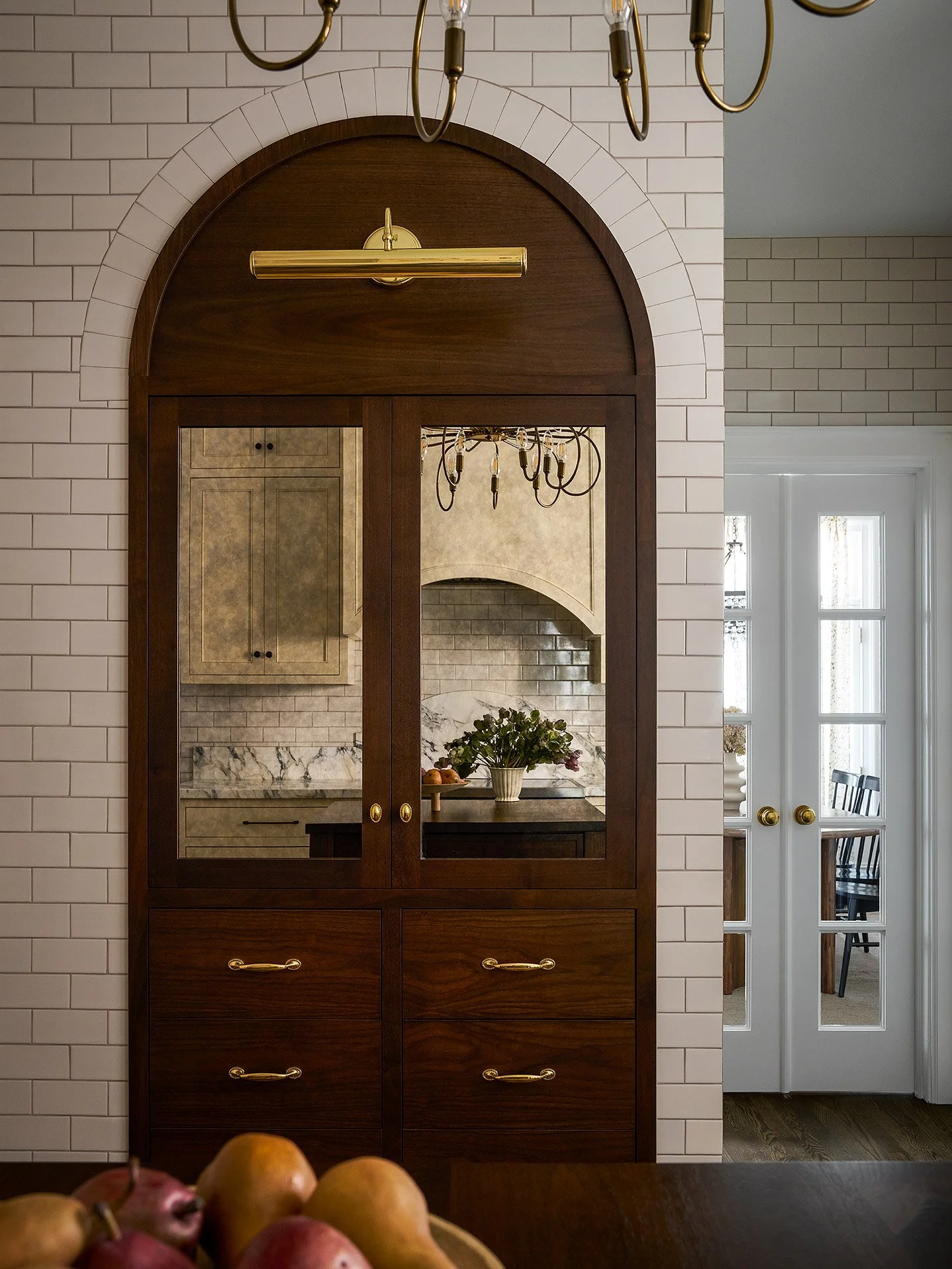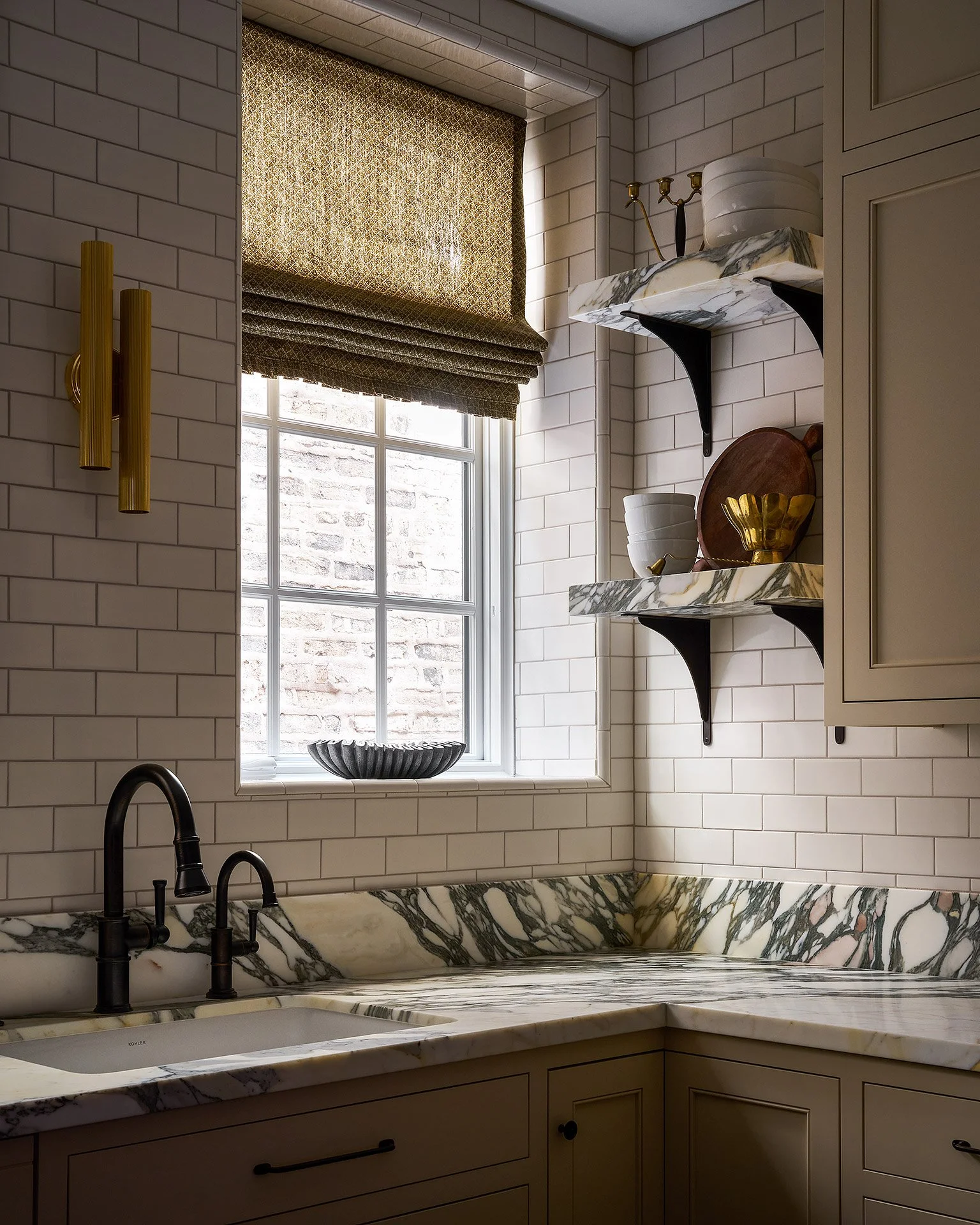 Before it was remodeled, this kitchen in the Gold Coast had a countertop jutting into the middle of the room and was beige all over. New cabinetry, appliances and custom island redefined the layout. Marble countertops and floor to ceiling subway tile gave the room a combination of inviting textures.